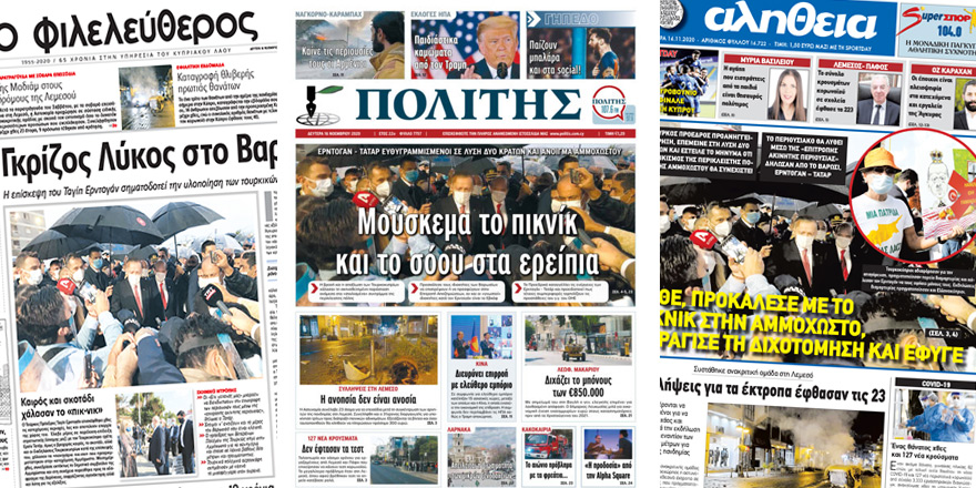 Haravgi: “Erdoğan’ın ‘Yeni Dönemi’ Kışkırtma – Diğer Açı: Mücadele Eden Kıbrıslı Türkler – Erdoğan Maraş İçin Yeni Bir Dönem İlan Etti – AKEL: Erdoğan’ın Ziyareti Tüm Kıbrıs Halkı İçin Kışkırtıma”.