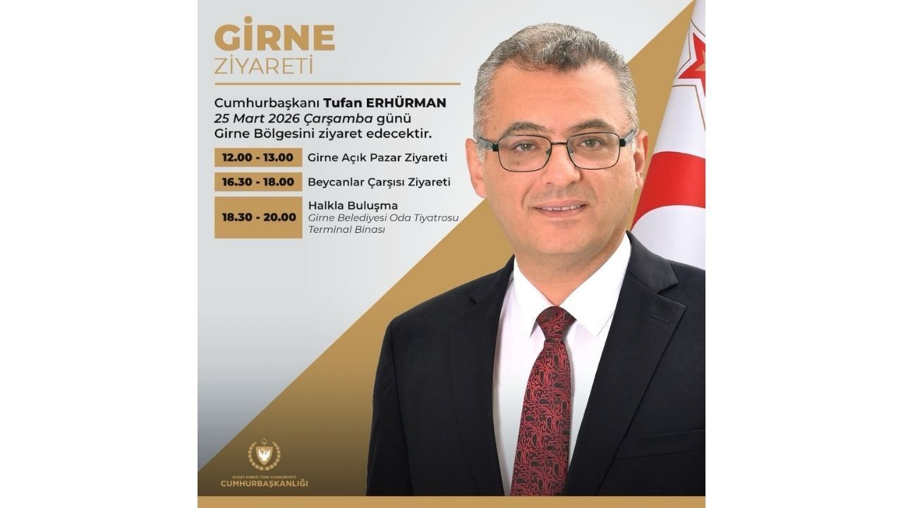 KKTC Cumhurbaşkanlığı, Cumhurbaşkanı Tufan Erhürman’ın 25 Mart Çarşamba günü Girne’de gerçekleştireceği ziyaret programını kamuoyuyla paylaştı. Açıklamaya göre Erhürman, gün boyunca çeşitli temaslarda bulunarak hem esnafla hem de vatandaşlarla bir araya gelecek.
