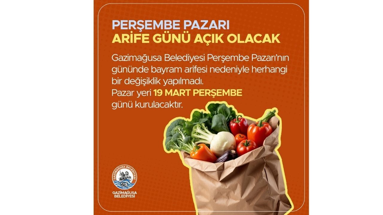 Gazimağusa Belediyesi, Ramazan Bayramı öncesinde vatandaşların alışverişlerini daha rahat yapabilmesi için önemli bir düzenlemeye imza attı. Yapılan açıklamaya göre, her hafta kurulan Perşembe Pazarı, bu yıl arife gününe denk gelen 19 Mart Perşembe günü açık olacak.